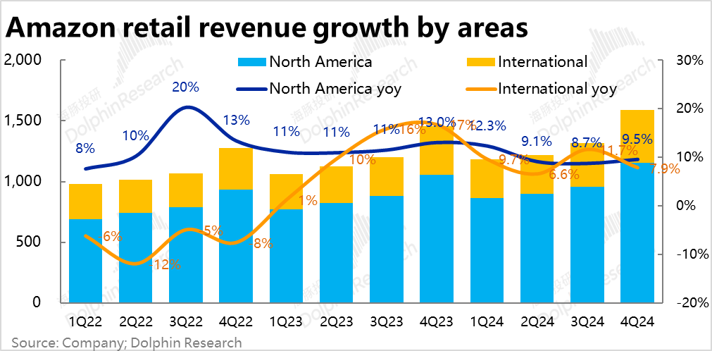 2. 泛零售板块本季度的营收增速为9.1%,较上季度略微降速0.4pct,和市场预期一致。分地区表现,北美零售的增速实际从8.7%明显加速到9.5%,这和高频调研数据显示美国假期消费是比较强劲的情况一致。不过,本季国际零售业务的名义增速从11.7%大幅降速到了7.9%,在不变汇率下,国际地区的增速依旧环比下降了3pct。可见国际地区(可能主要是欧洲地区)的拖累,以及汇率负面的影响是零售板块增长略有走弱的主要原因。