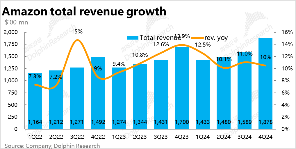 由于AI是当前毫无争议的市场投资主线,市场在公司各项业务之中,对AWS的表现尤为看重。本季AWS的营收同比增速为18.9%,相比上季放缓约0.2pct,也比卖方预期低0.1pct。不过据海豚投研了解,买方期待仍是20%或更高的增长。因此,AWS的增长显然是不尽人意的。