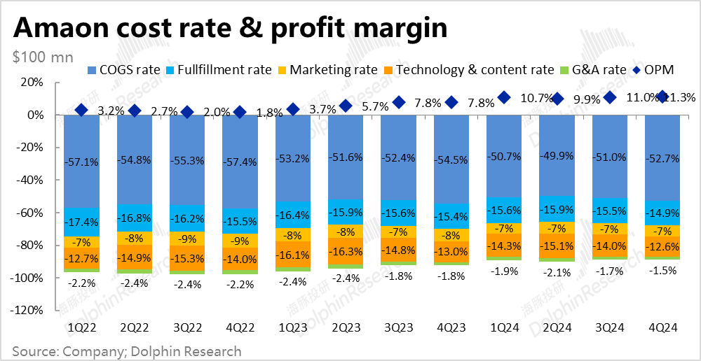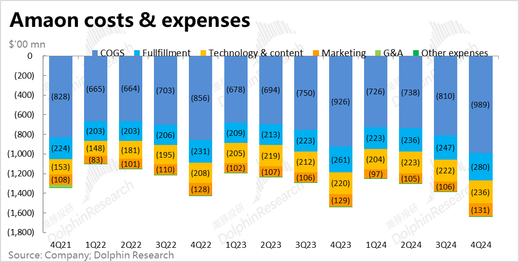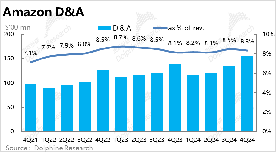 成本和费用的角度:(1)本季的毛利率为47.3%,低于预期的48.2%。海豚投研认为,汇率的负面影响,Capex投入增长导致折旧上升,高利润的广告和3P业务相对增长更弱,都是毛利润率下滑的诱因。