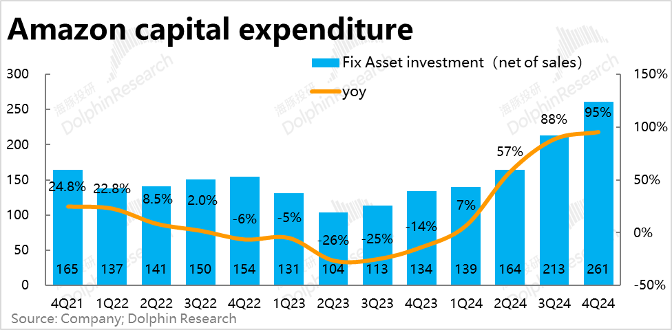 但也需要注意,本季度亚马逊的Capex大幅再度环比拉升了约50亿美元到276亿美元(这里是公司现金流量表中披露的口径,和电话会中口径有一些误差,但大体相同),同比增速继续拉高到了95%,无论是投入绝对值还算增长速度,都再创了新高。