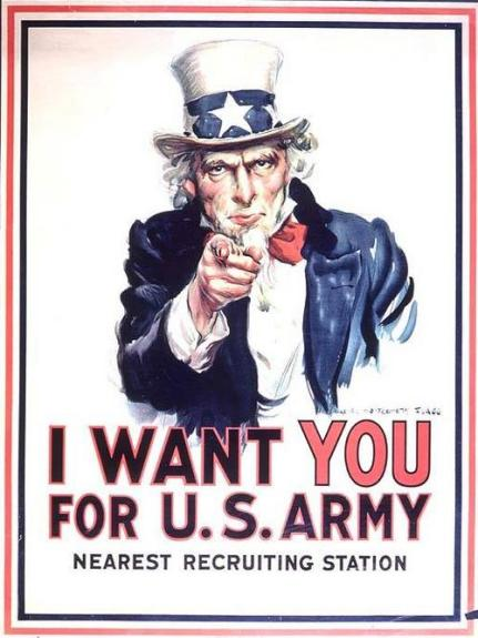 这是一幅广告画,画的并非征募者落在画家视网膜上的像,实地观看时的深度线索使画家倾向于维持大小恒常性,在做了视觉补偿之后,他看到的是一个正常人,而非巨手小头的怪人。因此,画家作画时,错觉元素在有意无意地起作用,而对视错觉的特意使用又使其多了一种表现手段,得以达到意想不到的艺术效果。