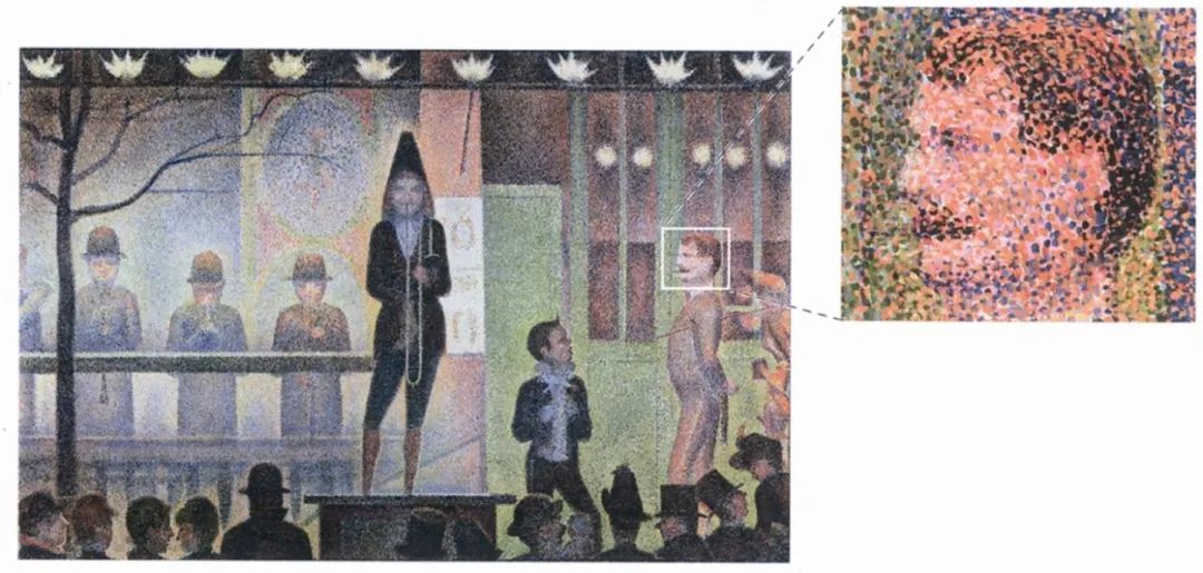 修拉的《观看表演》,远看颜色非常丰富多彩和逼真,近看却只有有限的几种颜色的色点。图片引自:WOLFE J M,KLUENDER K R,LEVI D M,et al.Sensation&Perception[M].Sunderland.MA:Sinauer Associates Inc,2006