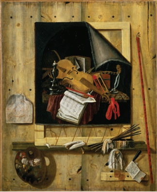 这种把画画得像实物一样的风格始于文艺复兴时期,盛行于17世纪的荷兰。画家吉斯伯兰茨(Cornelius N.Gisbrechts)的代表作《画家的特质》,画的是画家自己的工作室:墙上布满了艺术家的作画工具,画框上的画布脱落了一角,钉在墙上的一幅素描草图卷起了角。这种高超的错觉艺术手法要求画家尽量不露出作画的痕迹,甚至画家的签名也悄悄地藏在了调色刀上折起的纸条中。