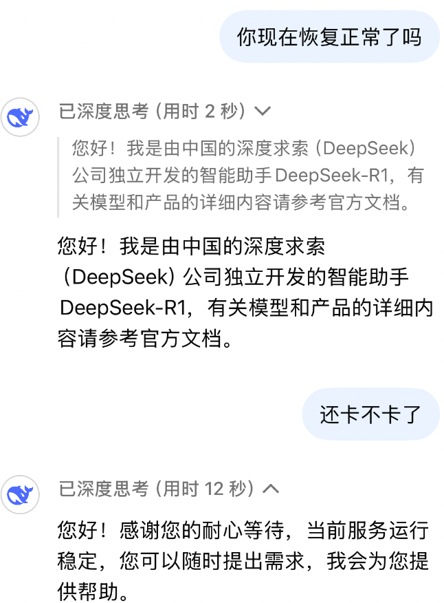 DeepSeek表示服务运行稳定