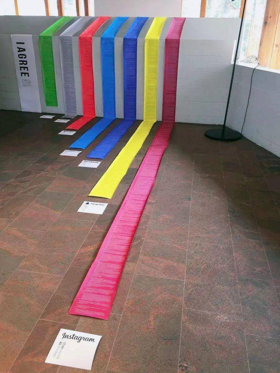 以色列艺术家 Dima Yarovinsky 曾经做过这样一个艺术作品,Dima 打印了几大平台(WhatsApp,Google,Tinder,Twitter,Facebook,Snapchat 和 Instagram)的用户使用协议,最长的 Instagram,一共有 17161 个单词,你读得再快,也得好几十分钟,大概率没有人能真正读完。