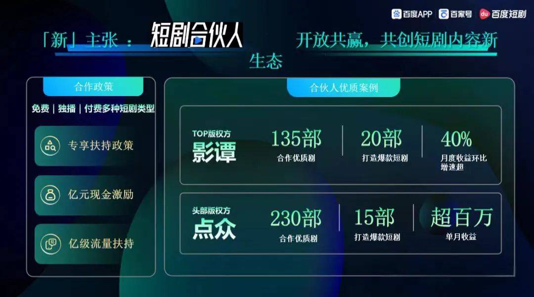 今年春节档前,百度就已发布短剧片单。除此之外,百度还推出“短剧合伙人”计划,提供现金和流量激励。计划在2025年对短剧业务进行全面升级,据业内人士透露,百度还将出海短剧领域重点发力。
