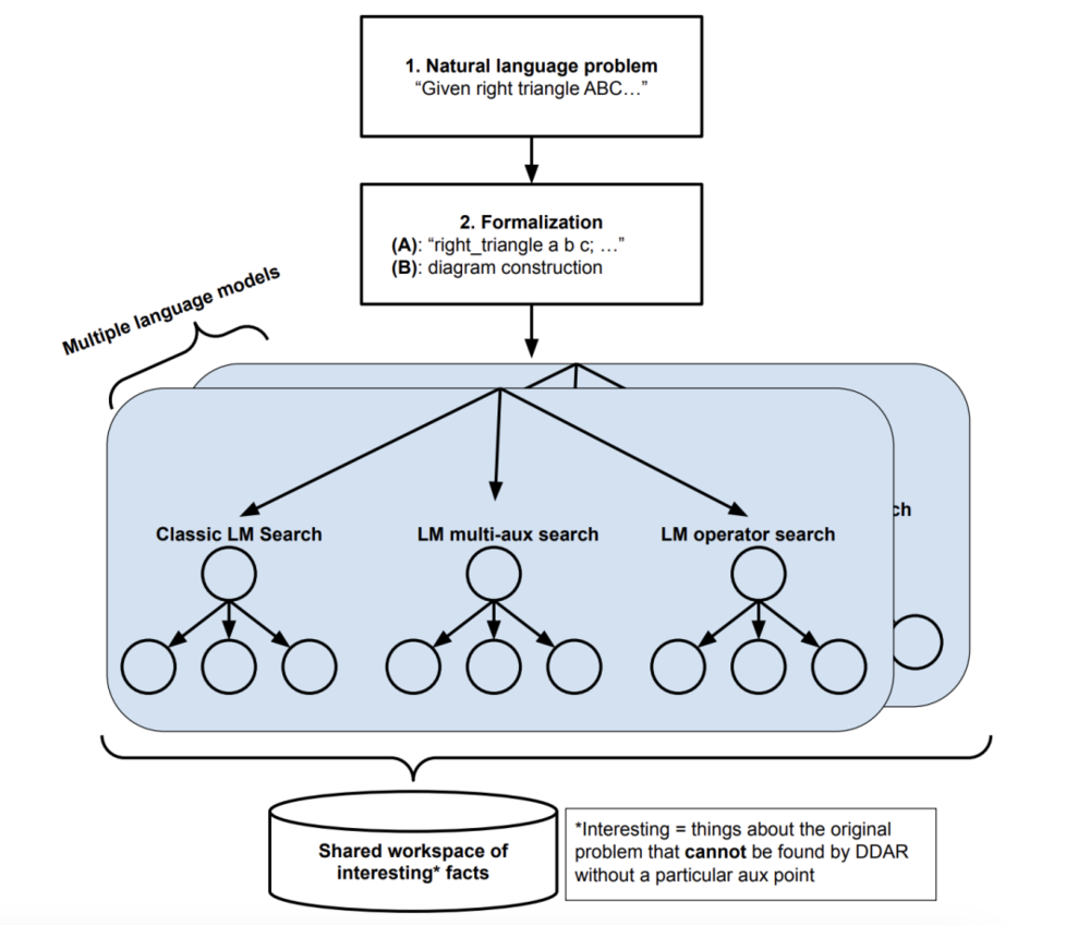 此外,AG2 还采用了 Gemini 语言模型,相比 AG1 具有更强的数学推理能力。该语言模型用于预测几何构造(如辅助线、角度计算等),并帮助生成解题步骤,其训练数据包含 3 亿条自动生成的定理和证明,大幅扩展了 AI 的数学知识库。