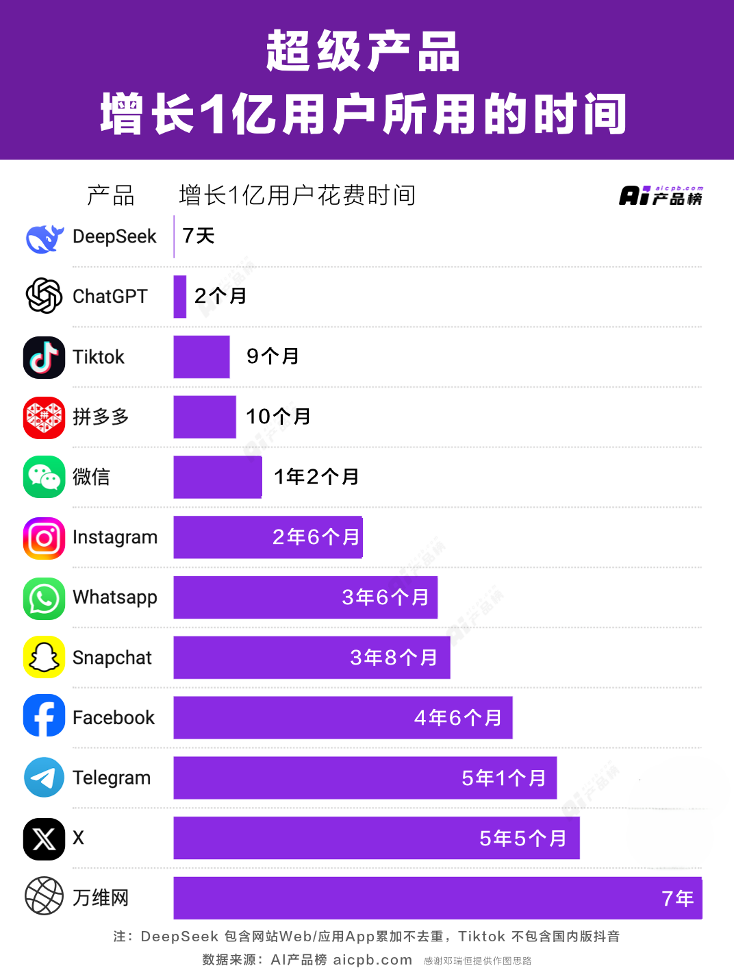 不仅如此,DeepSeek还创造了许多记录。据QuestMobile数据显示,DeepSeek在1月28日的日活跃用户数首次超越豆包,随后7天狂揽1亿用户,超越ChatGPT的用户增长速度,成为史上用户数增长最快的互联网产品。