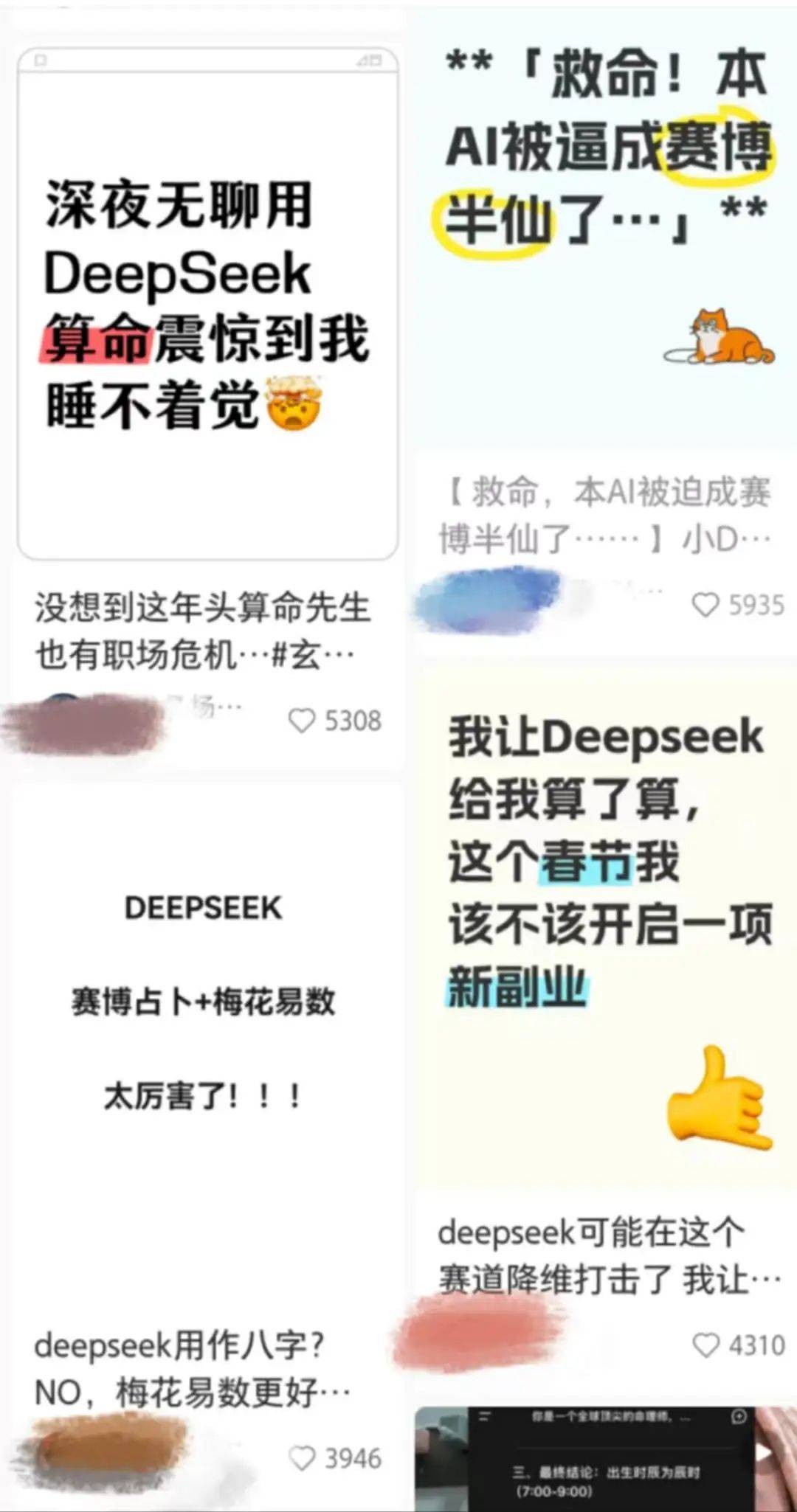 值得注意的是,传统赛道也获得了DeepSeek的加持,很多人反馈DeepSeek的玄学解答,比很多大模型好用。所以在小红书中,DeepSeek吸引着一批又一批尝鲜的年轻人。玄学商家也通过DeepSeek焕发新春,他们打着AI炒股、算婚姻、看风水等口号,在平台开直播,用户通过礼物打赏,再帮他们用DeepSeek算风水。随表发一条博文,就能获得数千点赞。