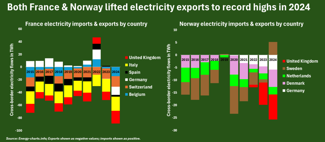 2024年,法国与挪威(右图)的电力出口量均达到历史新高;图表中纵轴正半轴为电力进口量,负半轴为电力出口量。来源:路透社