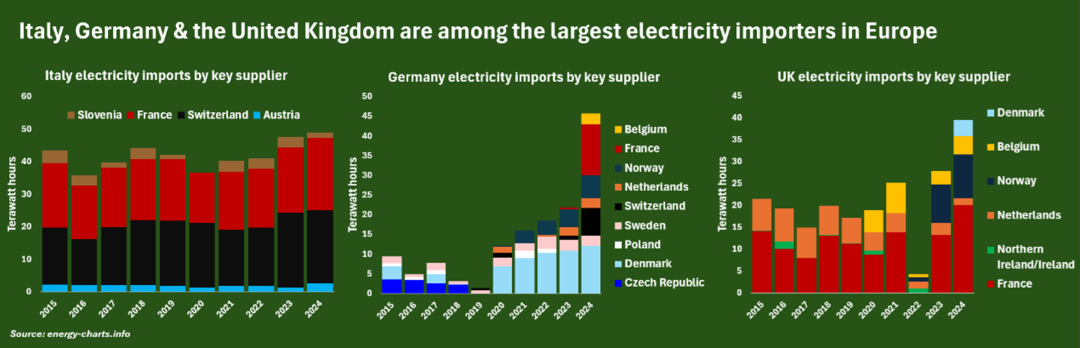 2024年,法国是英国和德国最大的单一电力供应国,也是继瑞士之后意大利的第二大电力供应国。