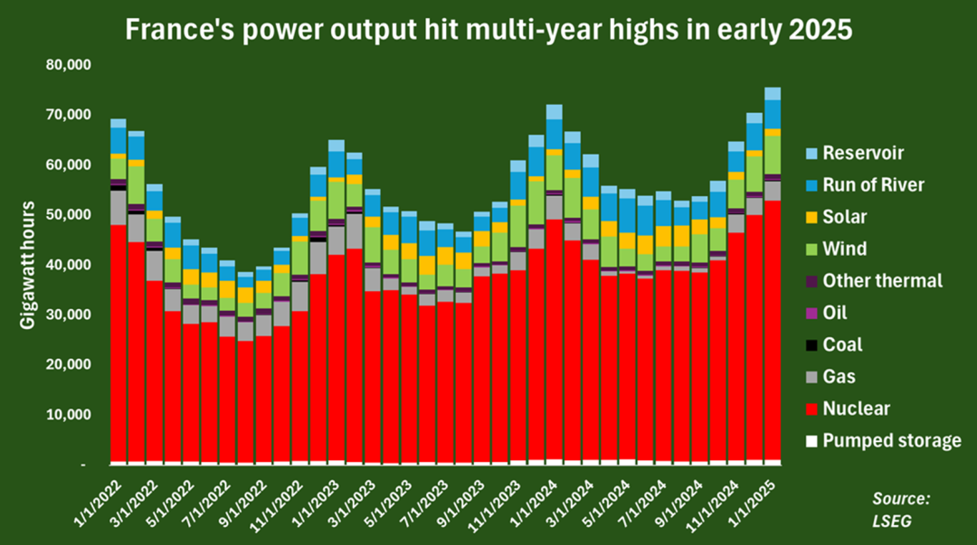 伦敦证券交易所数据显示,2025年1月法国发电总量为75577吉瓦时(GWh),为三年多以来的最高水平。
