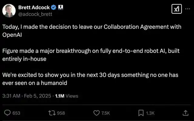 2024年8月,两家公司宣布Figure 02人形机器人将使用OpenAI模型进行自然语言交流。但是在本周,Figure AI宣布将退出与OpenAI的交易。OpenAI也在之前重启自己的机器人团队,并且还计划推出AI硬件产品。这或许意味着,双方都目前更倾向于垂直整合,完全自主地进行机器人的研发。