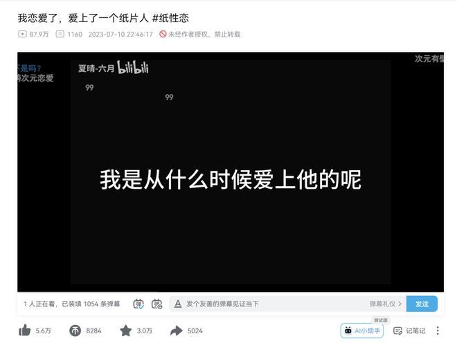 2023年7月,一则关于玩家与角色恋爱的视频《我恋爱了,爱上了一个纸片人》在B站收获了超过80万的点击量;2024年,《爱神的箭射穿我,却只和你擦身而过》在B站创造了70万点击量。同时,在国内规模最大的女性文学网站晋江文学城中,“纸片人”标签下的搜索记录多达近300页……