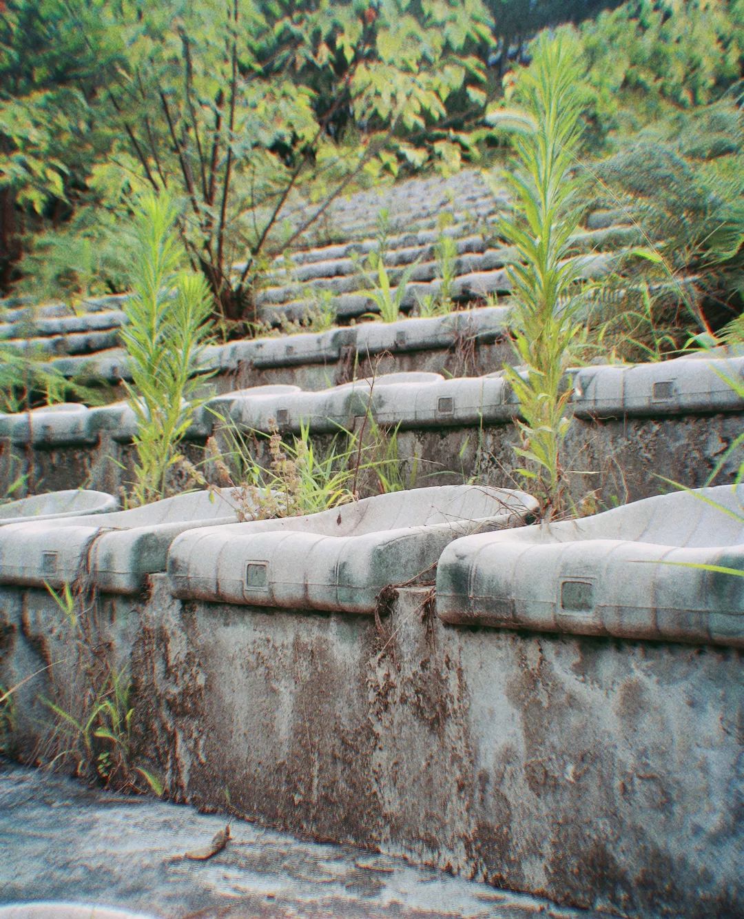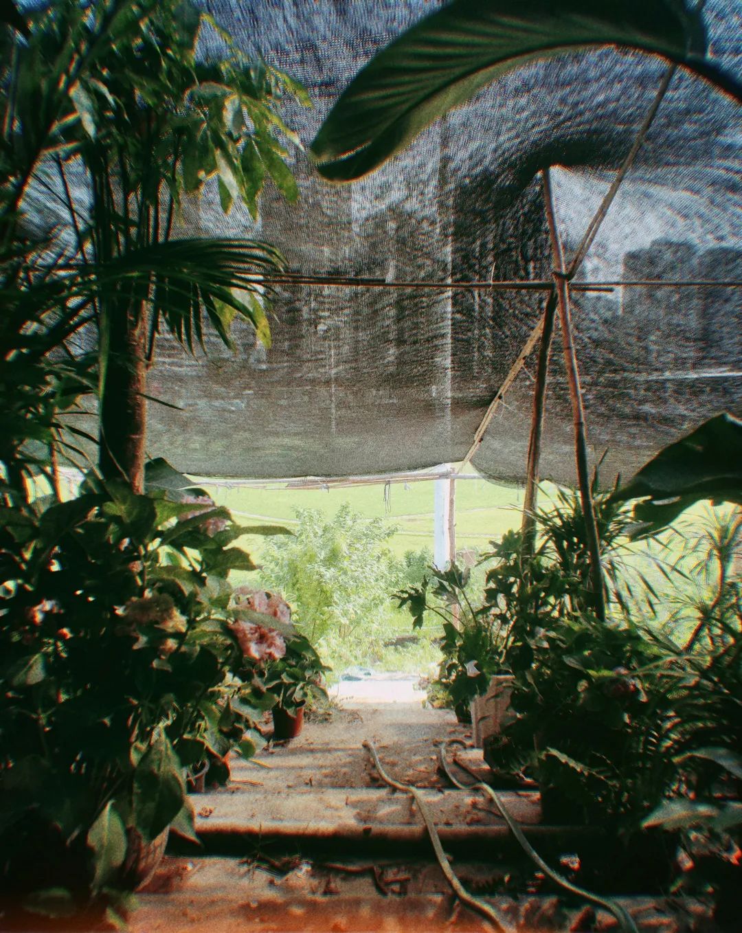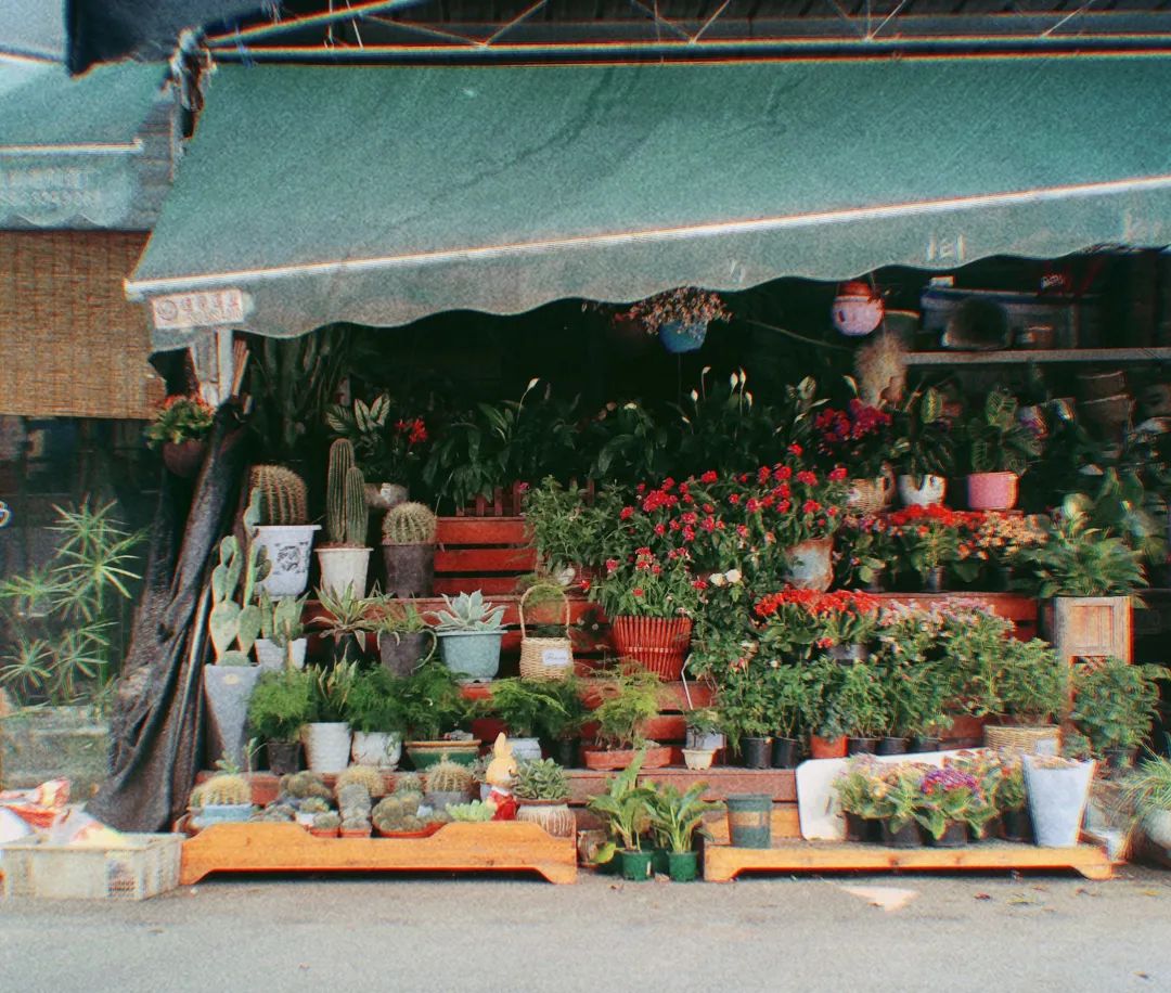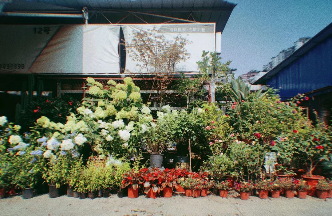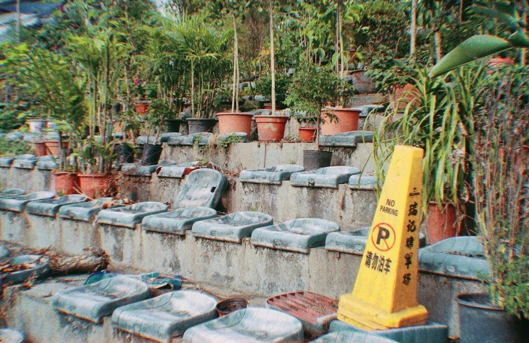 观众席上已长满杂草,破洞的蓝色塑料座椅上摆着一盆盆还未售出的植物。为了省电商铺里面一般不会开灯,从外围向里望,简陋的塑料棚下并排着繁茂拥簇的花枝与肥厚的叶片。