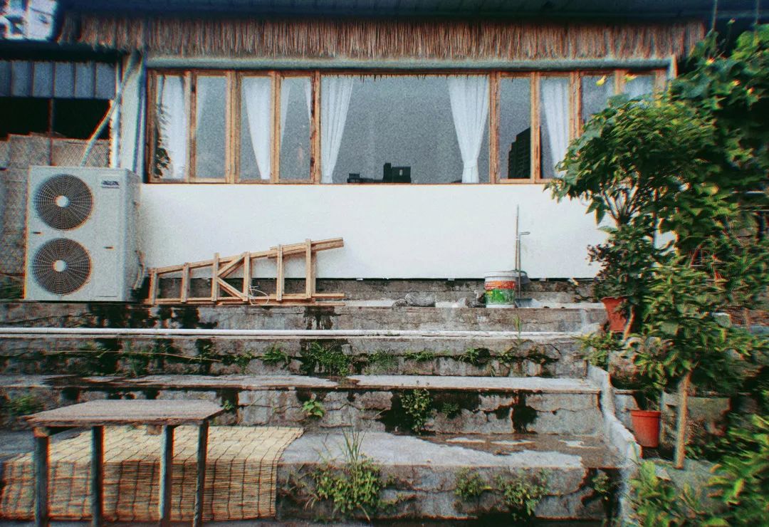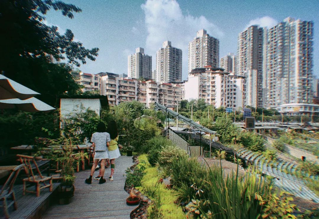 在花市之中还存在另一种成熟形态的商业空间,多为小众咖啡馆的形态。在买了一杯售价48块的美貌饮品以后,我得以窥探它的全貌。二层小楼的店面装修成日式风格,摆上老重庆风格的物件,占用了其他商铺屋顶建造了正对洋河体育场的顶楼花园。与前面两种以售卖商品为目的的业态不同,这种类型售卖的是舒适的消费环境和服务。