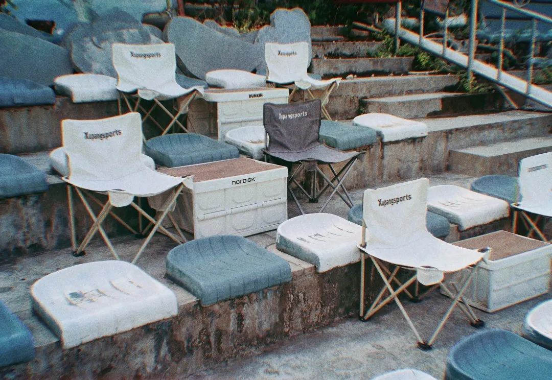 或许这样的店铺出现在花市显得格格不入,但是洋河体育场为这类商家带来了另一种目标客群——打卡废弃体育场的潮流青年。这种店面侵占体育场的空间功能又与前面花市卖家的“仓库”不同,临近店家打通入口附近的空间被精心装修为野趣后院,摆上了桌椅茶几,而废弃的观众席成为了拍照的景点。洋河体育场的灰色空间作为招揽消费人群的存在。