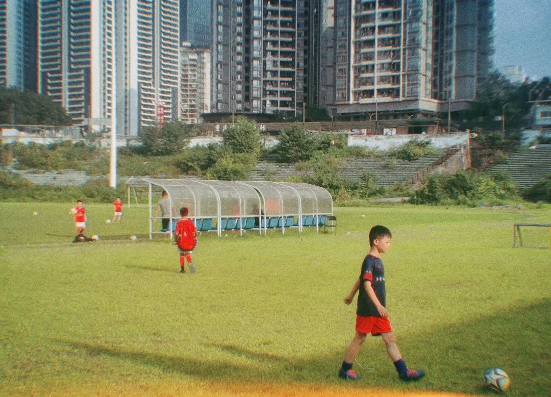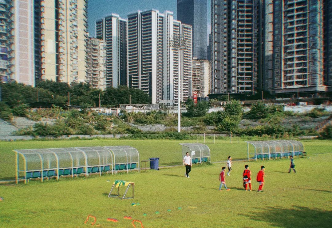 球门陈旧、场地周围杂草丛生,运动的地方虽没有刻意的修饰,却显得朴拙而整洁。有少年进入球场拿出足球练习了起来。虽然场地已经不能承载重庆足球的荣耀与赞美,但它被足球爱好者与训练的幼童如此真挚的对待,依旧有一种鲜活的生命力在。权力的更迭使这个空间获得美和尊严。