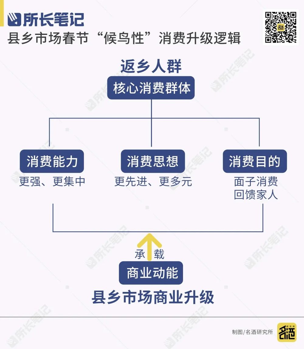 ①中国人的春节迁徙基本都有一个规律,即主要从发达地区到次发达或欠发达地区、从消费能力强的地方到消费能力没那么强的地方、从思想观念更开放的地方到相对没那么开放的地方。因此,当人们回到县乡市场,一方面带回来了更多的金钱,提振了消费能力,另一方面也带回来了更加多元的消费理念和需求。