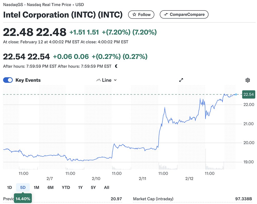 受此消息提振,英特尔股价连续两天大涨。前一天大涨是受美国副总统万斯在巴黎AI行动峰会上发言的影响,万斯称“特朗普政府将确保最强大的AI系统在美国建立,并使用美国设计和制造的芯片。”