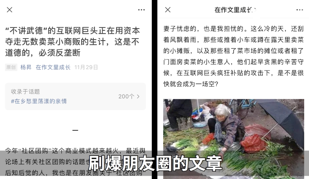 它的核心论点是互联网平台不讲武德,以巨额补贴的姿态进入社区团购、生鲜卖菜行业,挤压了中小商家的生存空间,尤其是菜场的菜贩,令人难过。
