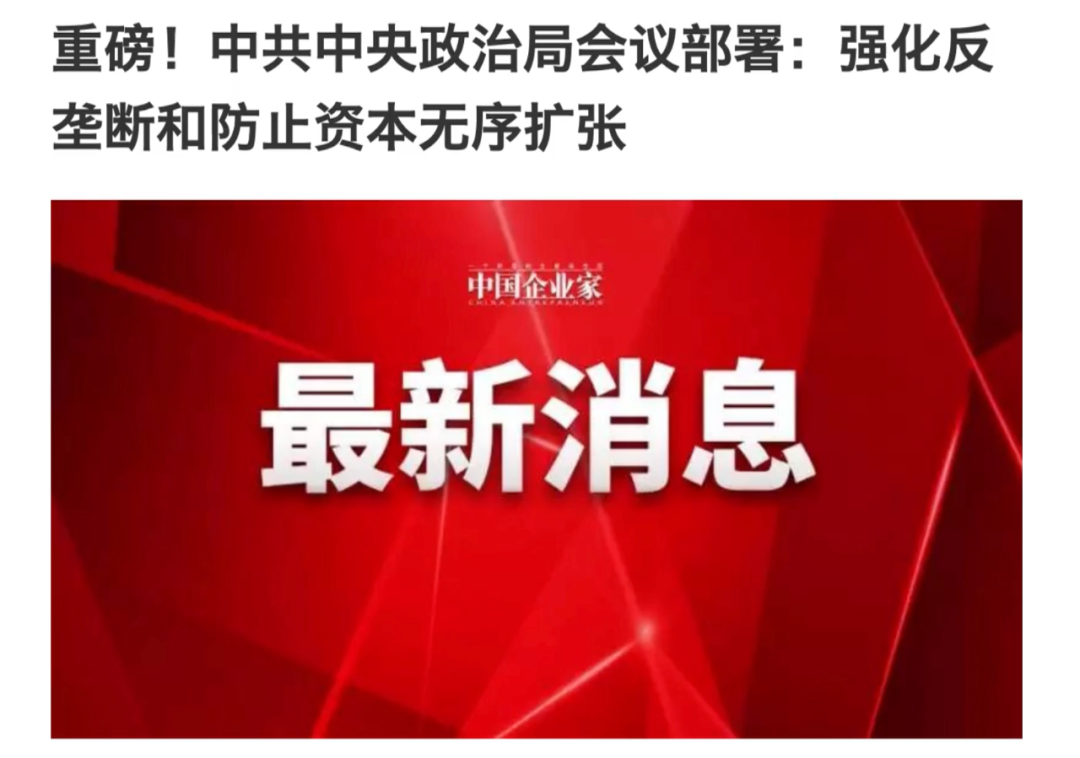 12月11日中共中央政治局召开会议,要求强化反垄断和防止资本无序扩张。