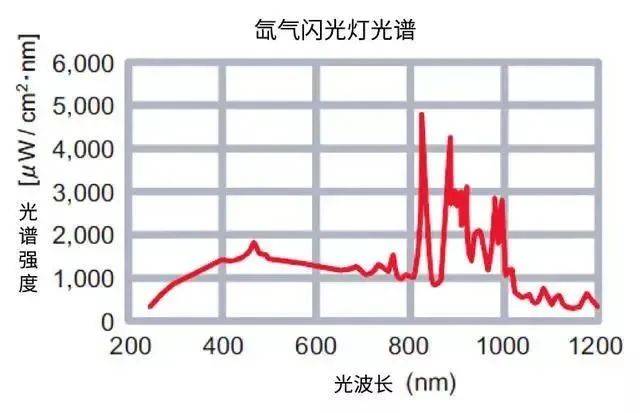 氙气闪光灯发射光谱:横坐标为波长范围,纵坐标为强度。|参考文献[1]