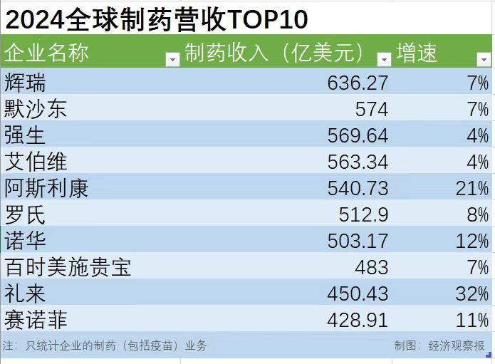 美国《制药经理人》(Pharm Exec)杂志2024年发布的最新全球制药企业TOP50榜单是制药行业公认的排行榜,该榜单主要依据各大药企的处方药销售收入进行排名。