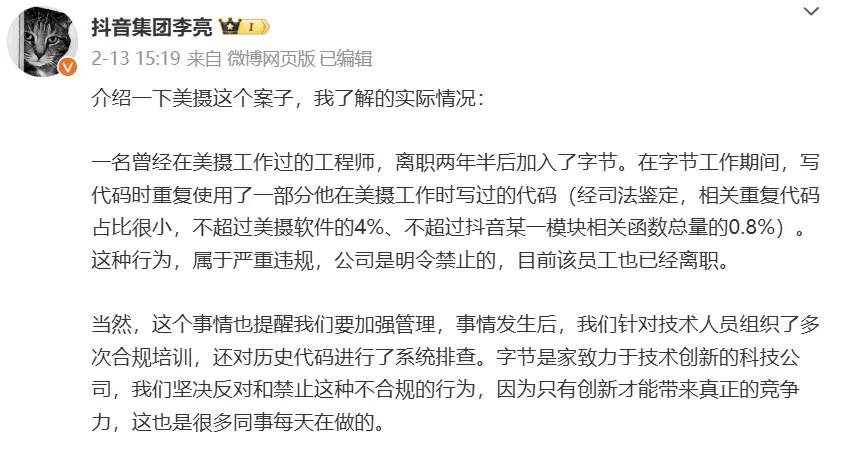他还表示:“事发之后,我们针对技术人员组织了多次合规培训,还对历史代码进行了系统排查。字节是一家致力于技术创新的科技公司,我们坚决反对和禁止这种不合规的行为,因为只有创新才能带来真正的竞争力,这也是很多同事每天在做的。”
