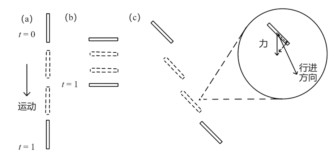 那么微生物如何游泳呢?如果你拿一个薄圆柱体,比如吸管,让它垂直落入像糖浆这样的高黏度流体中,它就会像预期的那样垂直落下[见图2(a)]。如果将吸管侧放,它仍然会垂直下降,但由于阻力的增加,速度只有直立情况下的1/2[见图2(b)]。然而,当你让吸管与水平位置成一定角度时(就像倾斜座椅的靠背一样),它不仅在糖浆中垂直向下移动,还会水平移动,导致其沿对角线方向下落。