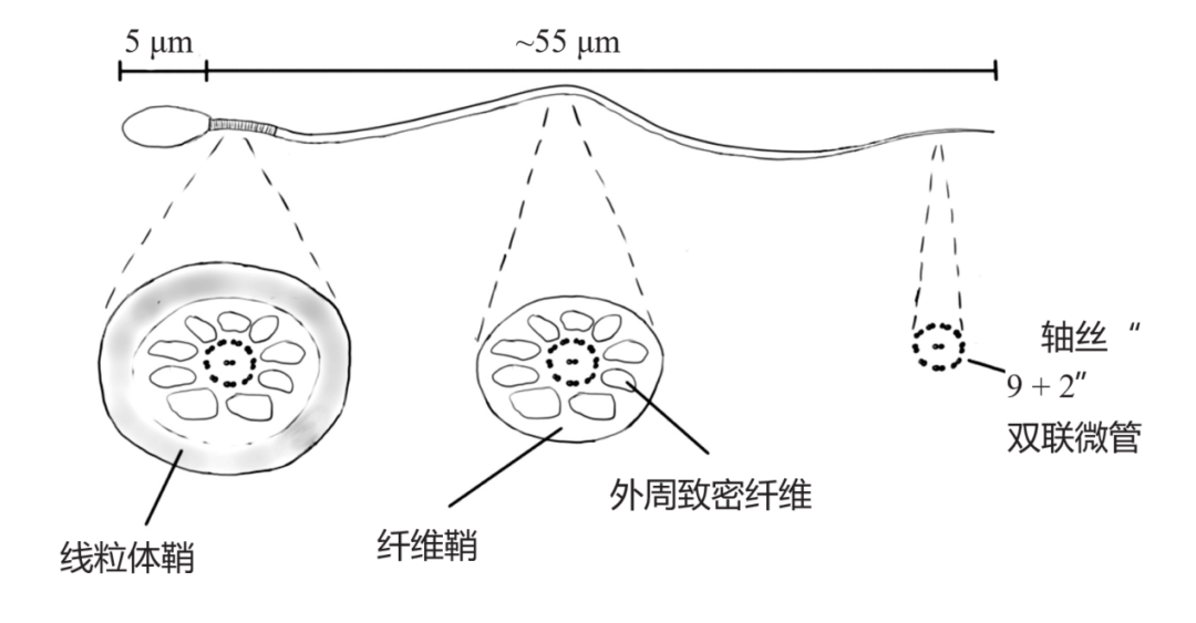 图3 精子尾部的主要组成部分是轴丝,其中包含“9+2”排列的微管组;尾部前方的轴丝被外周致密纤维和一根纤维鞘包围。