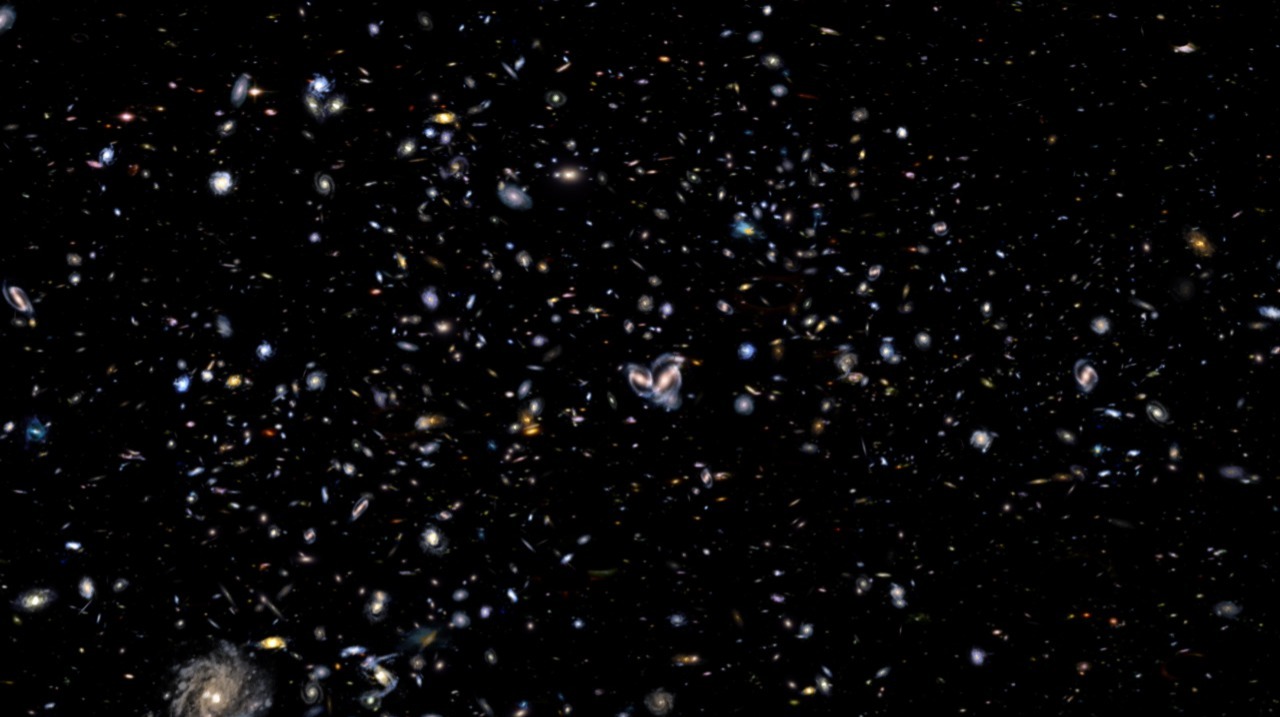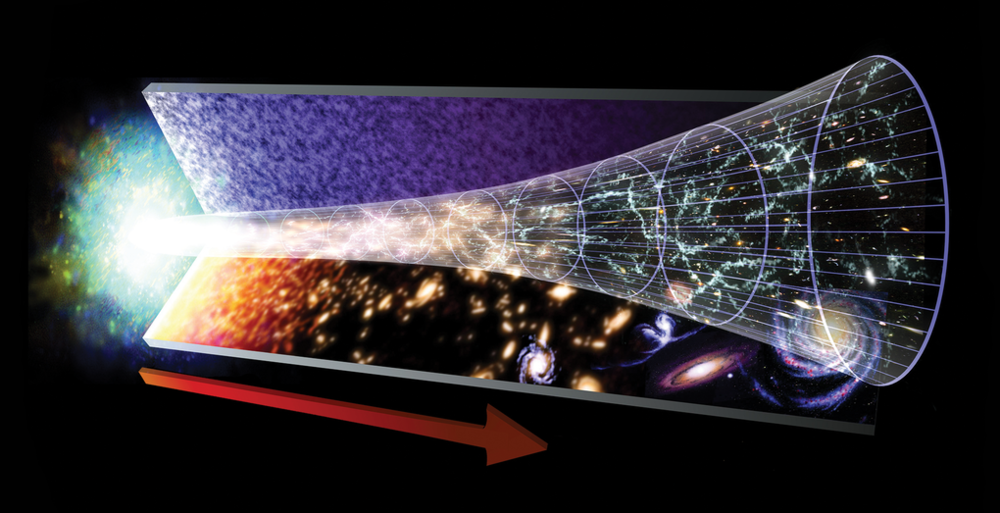 回到大约138亿年前,在大爆炸之后宇宙经历一次极其快速且短暂的暴胀时期,从而抹平了空间中的曲率,造就了我们所观测到的平坦的宇宙。自那之后,宇宙持续的膨胀、冷却和演化。在不同的地方,粒子会聚集逐渐形成星系和恒星。