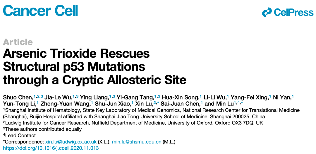 [1].Chen S, Wu J L, Liang Y, et al. Arsenic Trioxide Rescues Structural p53 Mutations through a Cryptic Allosteric Site[J]. Cancer Cell, 2020.