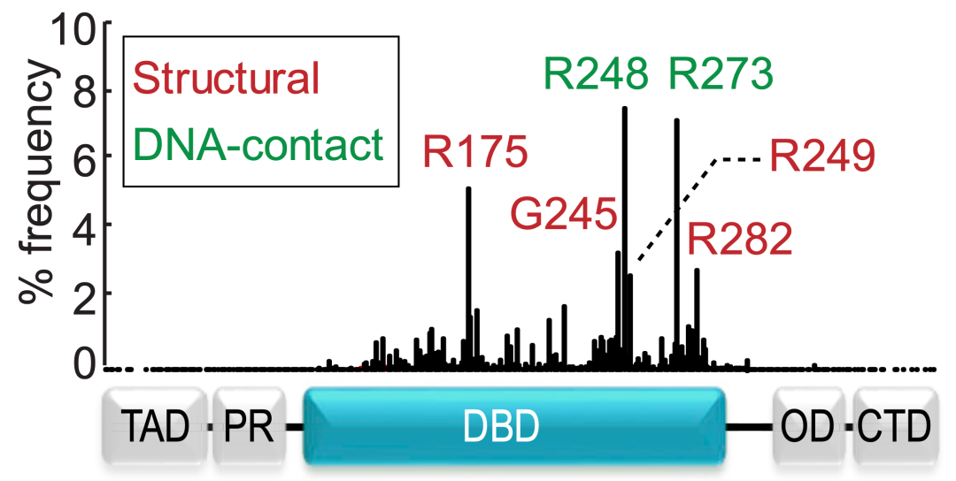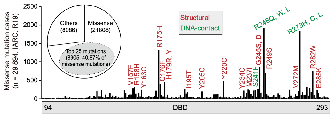 ▲ 不难看出,p53突变不仅主要分布在DBD区域,而且异质性非常高