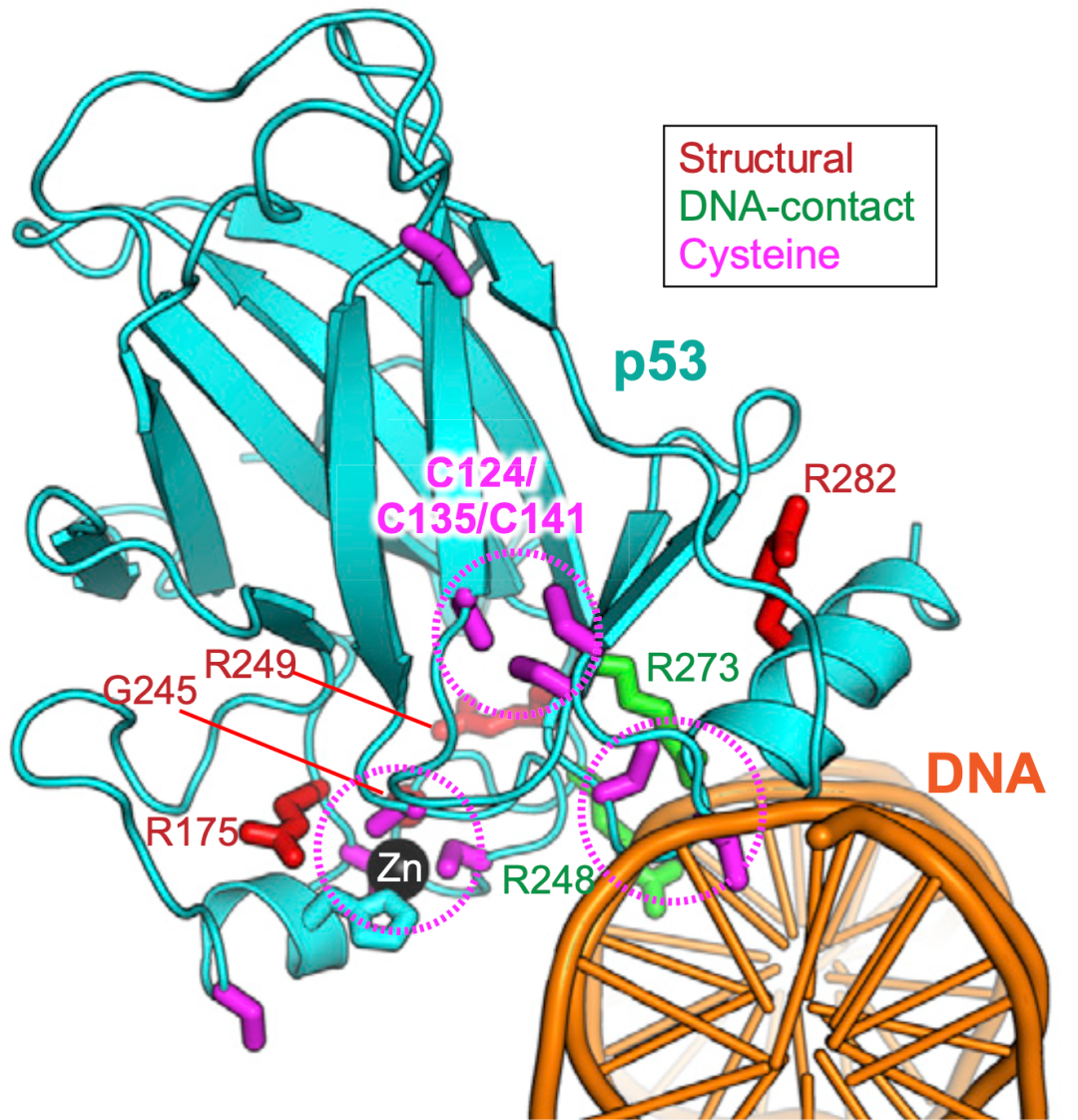 于是他们挑选了25个最常见的p53突变,它们都位于DNA结合域,且占到了癌症中p53错义突变的40.87%。其中18个是结构性突变,另外7个是DNA接触性突变。
