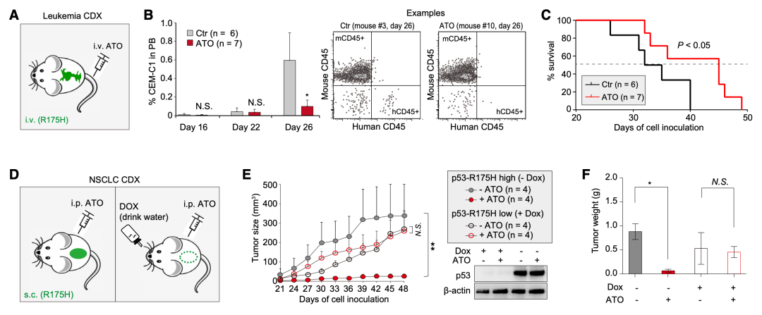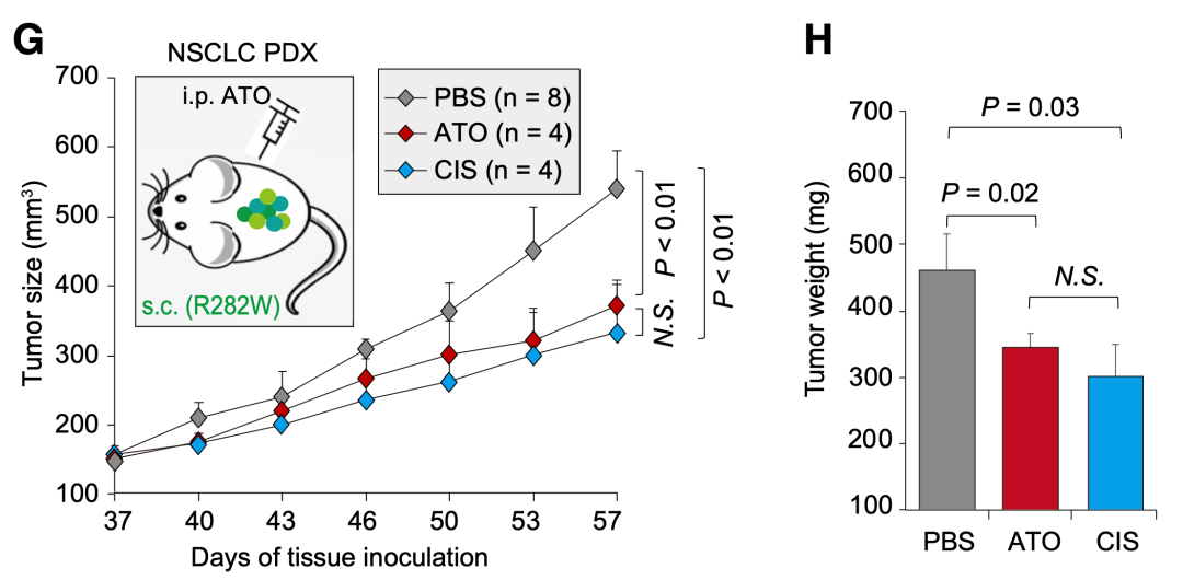 卢敏团队随后在CDX和PDX小鼠模型上探索了砒霜的抗癌效果。砒霜的使用剂量是5mg/kg,这个剂量在小鼠中产生0.05~0.2μg/mL 砷血浆浓度,在砒霜治疗的急性早幼粒细胞白血病(APL)患者中可以达到,而且不会产生严重的毒性[14,15]。