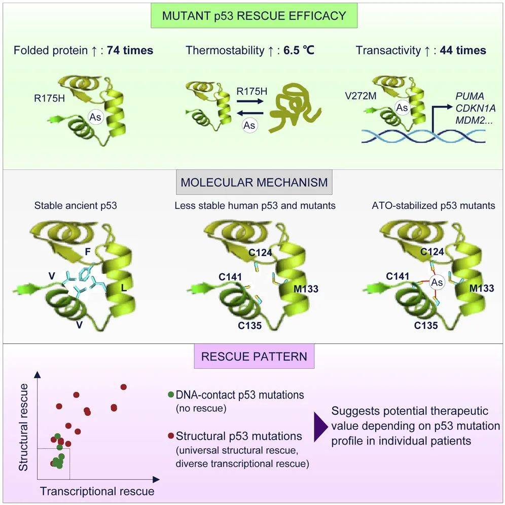 近日,由上海交通大学瑞金医院卢敏和牛津大学Xin Lu领衔的研究团队发现,砒霜(三氧化二砷,ATO)中的砷原子竟然能插入发生结构性突变、不能正常折叠的p53蛋白的DNA结合域,帮助突变p53蛋白折叠出有抑癌功能的三级结构[1]。