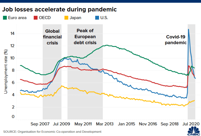 经合组织(OECD)指出,在一些国家,疫情对劳动力市场的早期影响“比2008年全球金融危机头几个月的影响大十倍。”