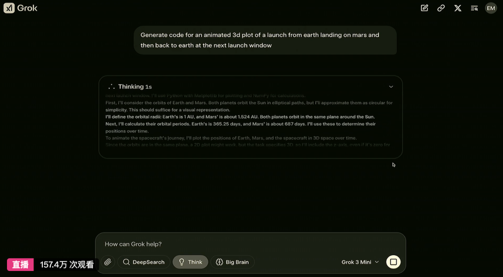 一个是请求生成一个从地球发射到火星并返回地球的3D动画代码,Grok思考了19秒,详细描述了其思考过程,包括使用Python进行绘图,以及使用NumPy进行计算。