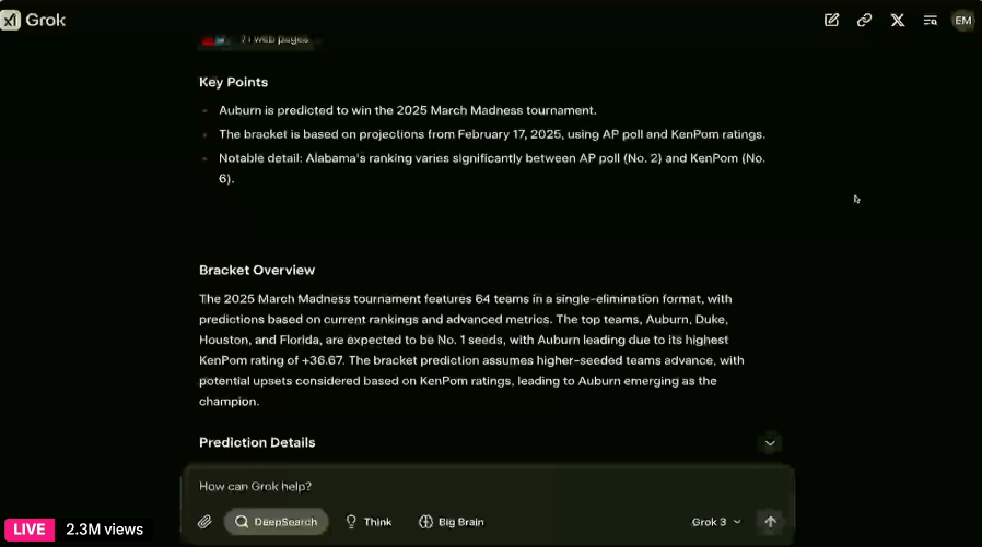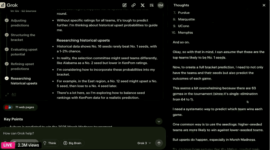 现场展示的环节里,工程师给Grok 3出了一道有趣的题:预测NCAA“疯狂三月”的胜负数,也就是所有层级里的比赛结果。
