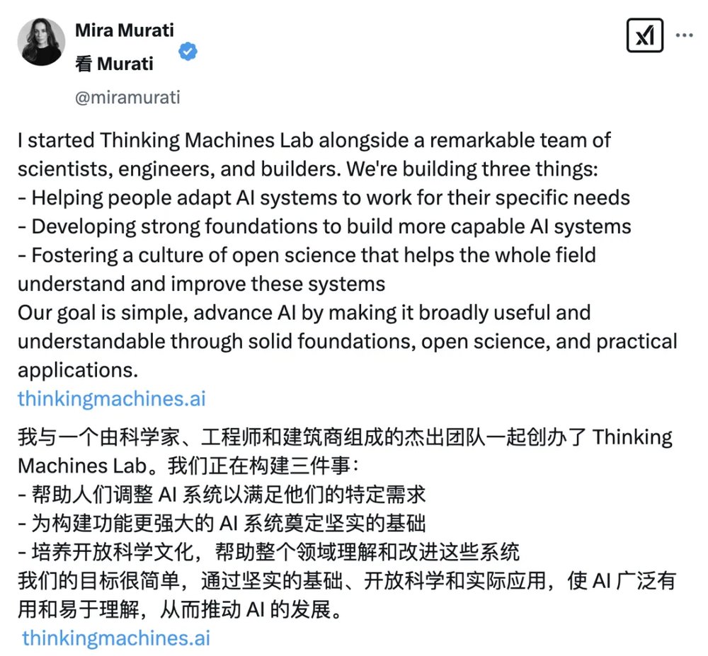 今天凌晨,Mira也在X平台发文阐述了新公司的成立初衷: