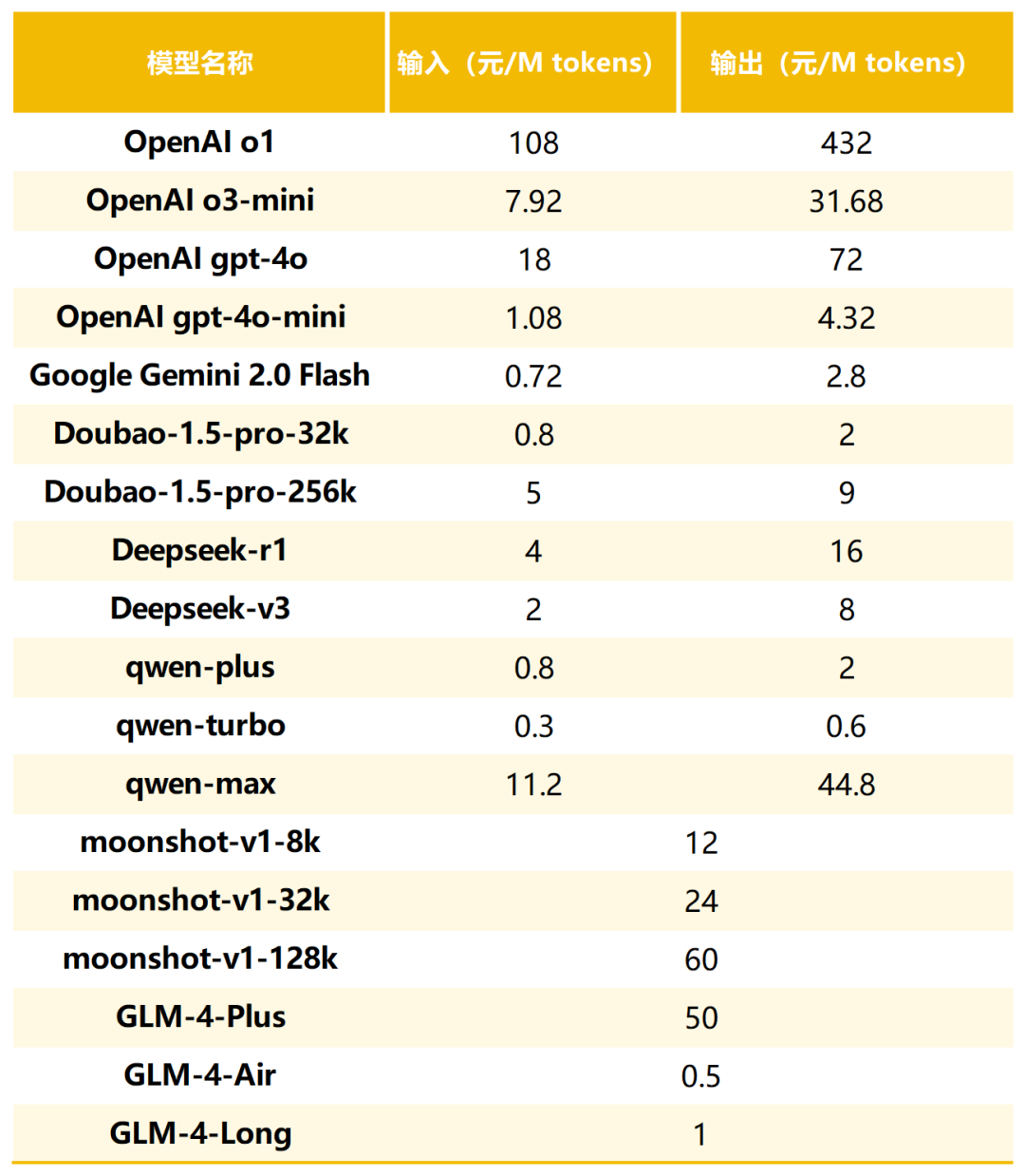 (2025年2月,部分大模型对话API调用价格)