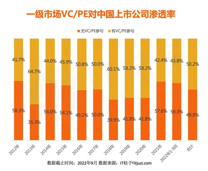之前有过数据统计,每年的上市公司中,大约有40%~60%比例的公司,在一级市场融过资。