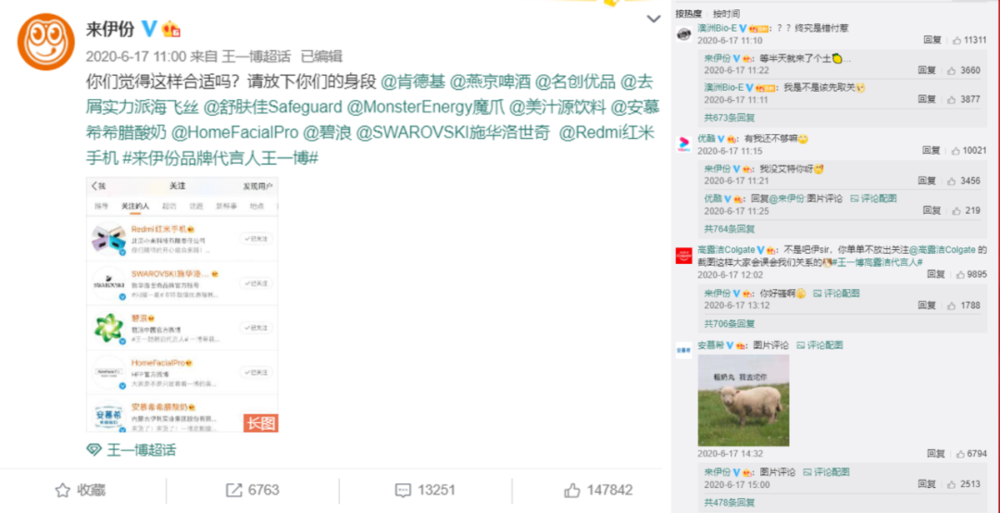 有意思的是,虽然王一博仅在5月发过一条成为来伊份代言人的微博,但来伊份微博的“含博”率相当高,达313条,相比施华洛世奇的56条、奥迪的13条,可以说是非常努力了。