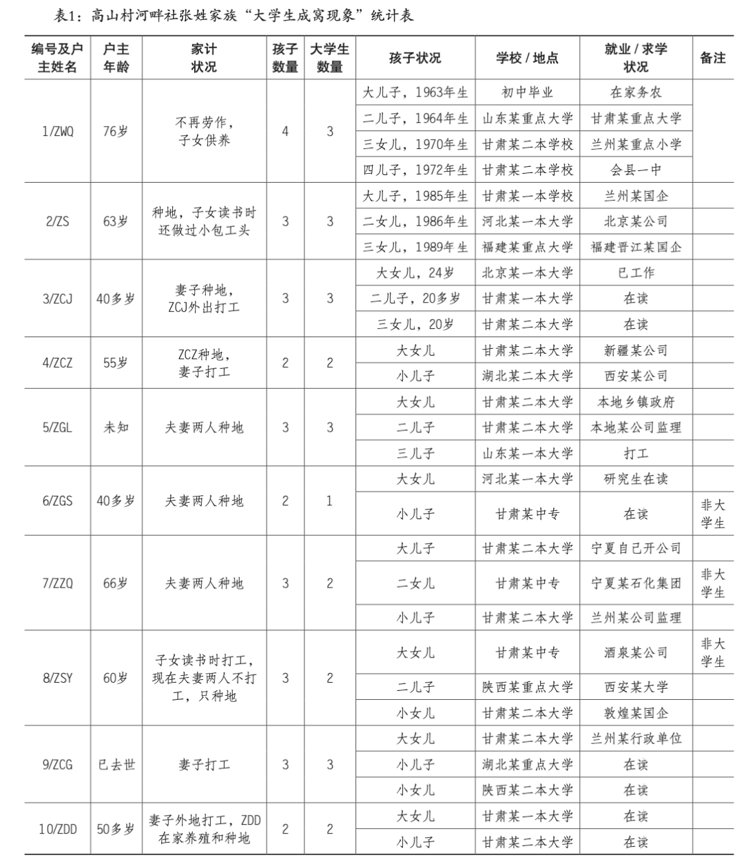 在会县一个普通村庄高山村,就出了100多个大学生,在高山村的河畔社,仅张姓家族(该社的大姓)就有28个大学生,有10户家庭有1个以上大学生。而类似河畔社的这种情况,在调查的其他村庄也比较普遍。因此本文以河畔社张姓家族的调研资料为基础进行分析。