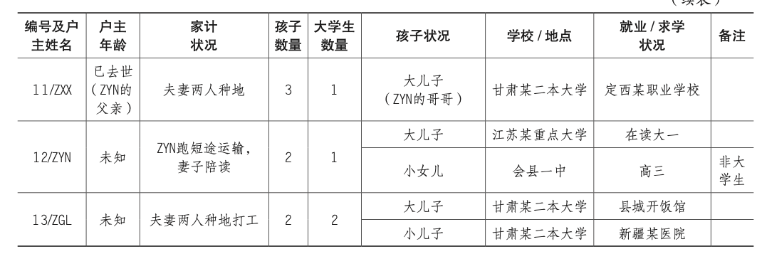 笔者于2017年11月在甘肃会县进行了为期25天的田野调研,采用无结构式与当地学校的教师、家长和青年学生进行了访谈。在调研中发现,当地农村大学生很多,且在分布上呈现出不均衡状态,有一个家庭里面有多个大学生的“大学生成窝”现象。这与其他地方存在差异,比如同是生育数量较多的广西、贵州等地区,基本上不存在大学生成窝的情况,不仅大学生少,而且一户内出现多个大学生的情况更加罕见。