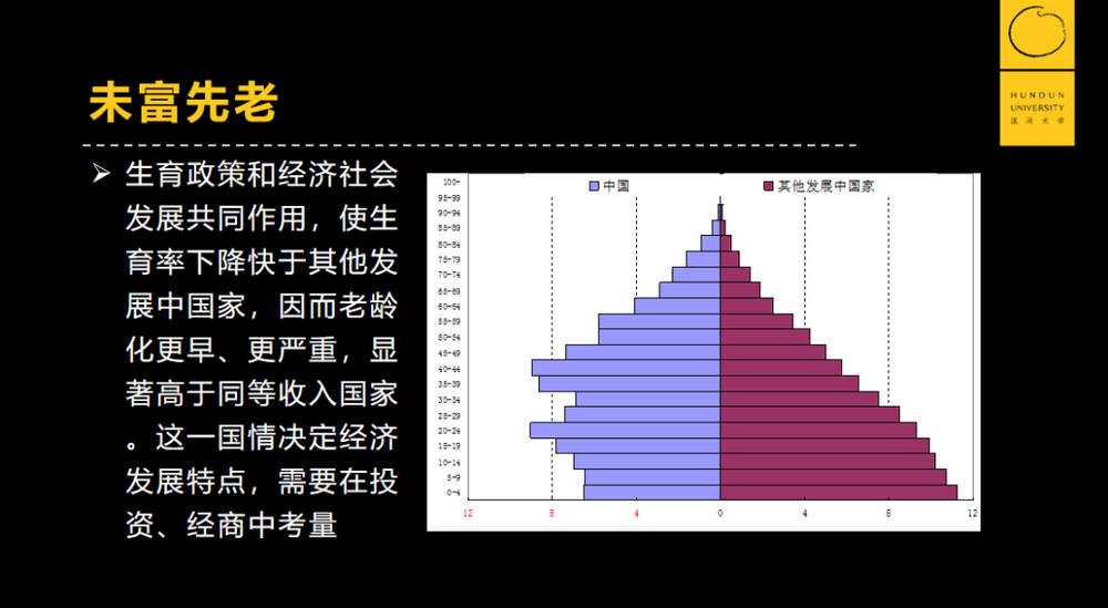 这张图是人口学家经常说的人口金字塔图,纵坐标是人口年龄,图的形状代表人口的年龄结构。大家可以看到,右边是不包括中国在内的其他发展中国家的人口数据,接近于是金字塔的形状。左边是中国的,越来越像一个橄榄形状,但我们还是发展中国家,还没有进入到高收入国家的行列,但是老龄化程度已经越来越接近高收入国家了,这就是未富先老。