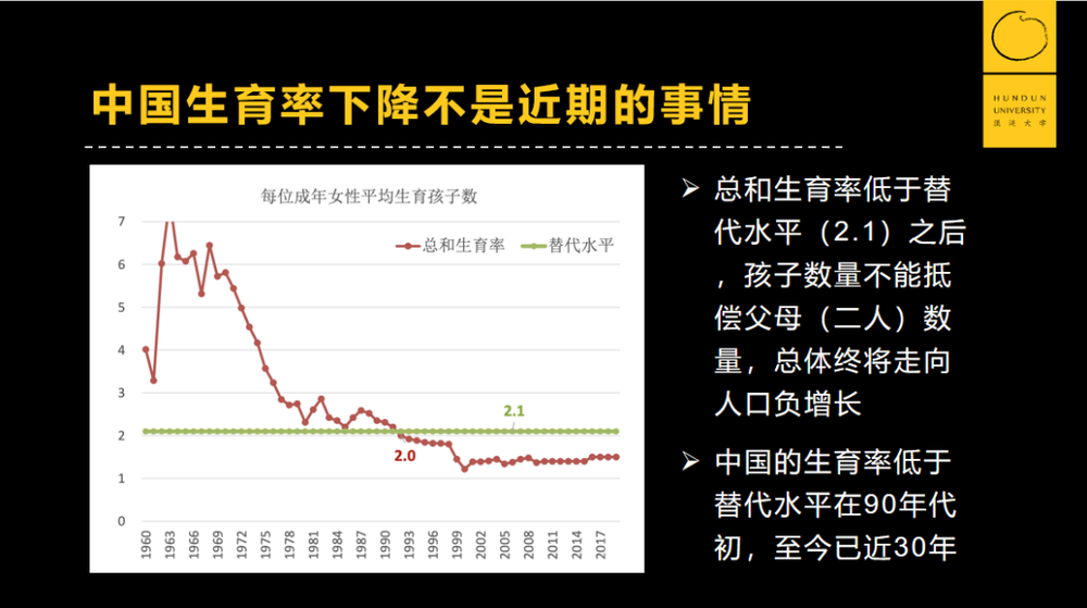 这里有一个知识点叫“总和生育率”,是指一个妇女终生生育的孩子数,也就是说夫妻两人终生生育多少孩子才能替代我们自己呢?应该就是两个。但是人口学上有一些特殊规律,所以2.1这个总和生育率正好能把父母替代掉,所以叫“替代水平”,高于2.1就算是高生育水平,低于2.1就是较低的生育水平,而长期低于2.1就意味着,终究有一天人口会负增长。