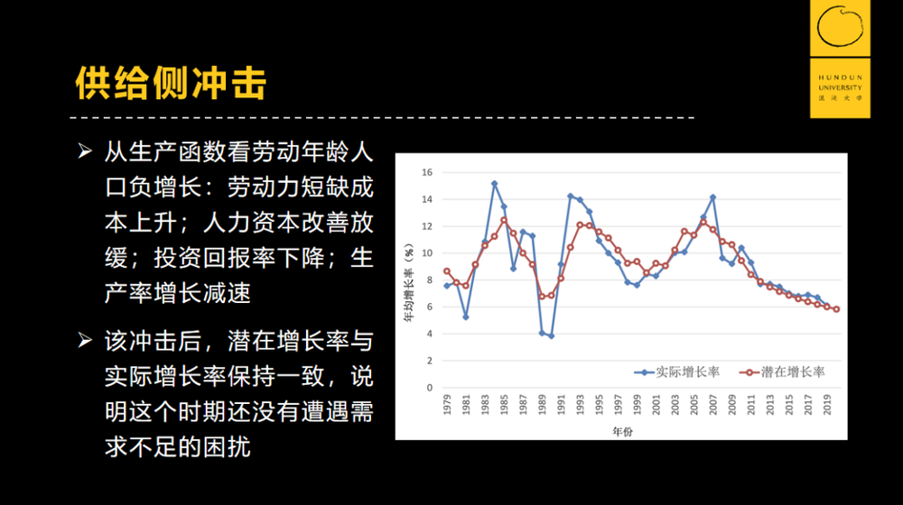 供给侧冲击之前已经发生了,2010年第一次人口转折时,劳动年龄人口到达峰值,之后都是负增长。在这个过程中,我们也正好经历了经济增速下行的趋势。