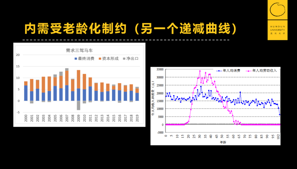 而消费需求又受到老龄化的制约。20岁前人们没什么收入,随着年龄增长,收入逐渐提高,在30到40岁之间达到高峰,随后逐渐退出劳动力市场,收入减少,到60岁后基本没有劳动收入了。